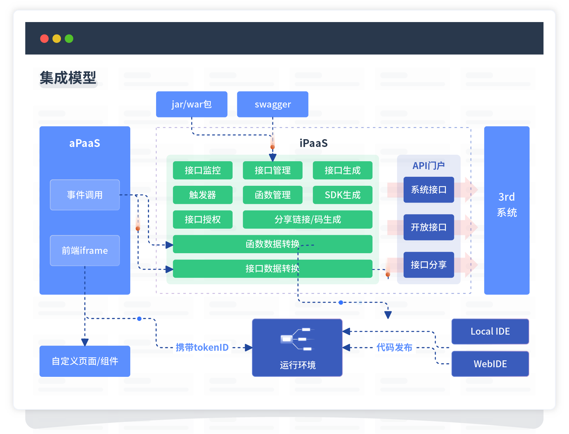 集成模型包括平台本身前、、、、、、后端能力的扩展,,,,,,,也支持通过API门户和第三方系统进行交互。。。。。。
