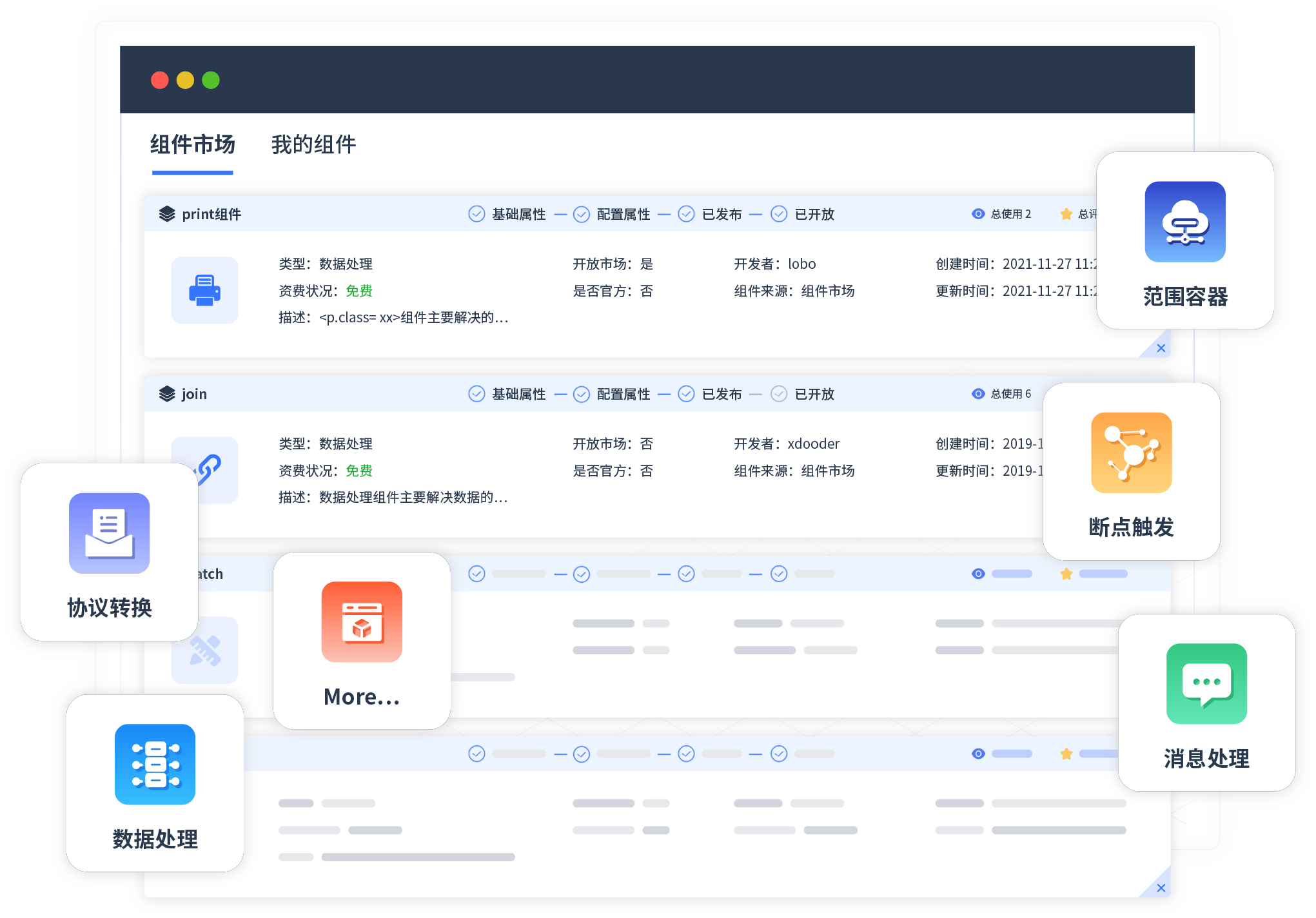 针对集成场景,,,,,,,NO钱包提供组件市场,,,,,,,,,,,,例如协议转换、、、、、、、、、、消息处理、、、、、、文件操作等。。。。。。。。。。。。除平台提供的组件外,,,,,,,,,客户可以自定义所需组件。。。。。。。。。。