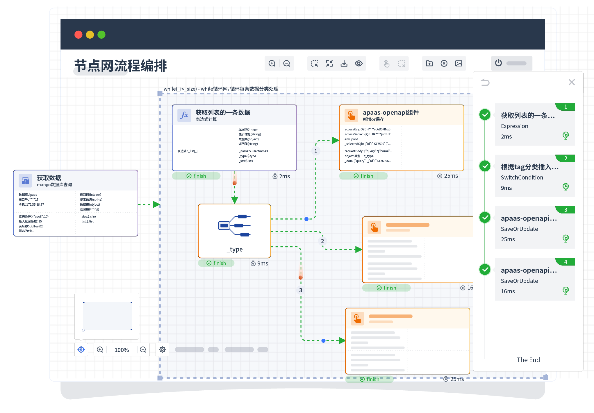 针对集成场景,,,,,,,,,组件定义后支持进行流程编制,,,,,不同于传统代码方式,,,,,,,通过图形化展示,,,,,,,,,,,支持在线调试、、、、、日志查看和运行回放。。。。。。。。。。。。