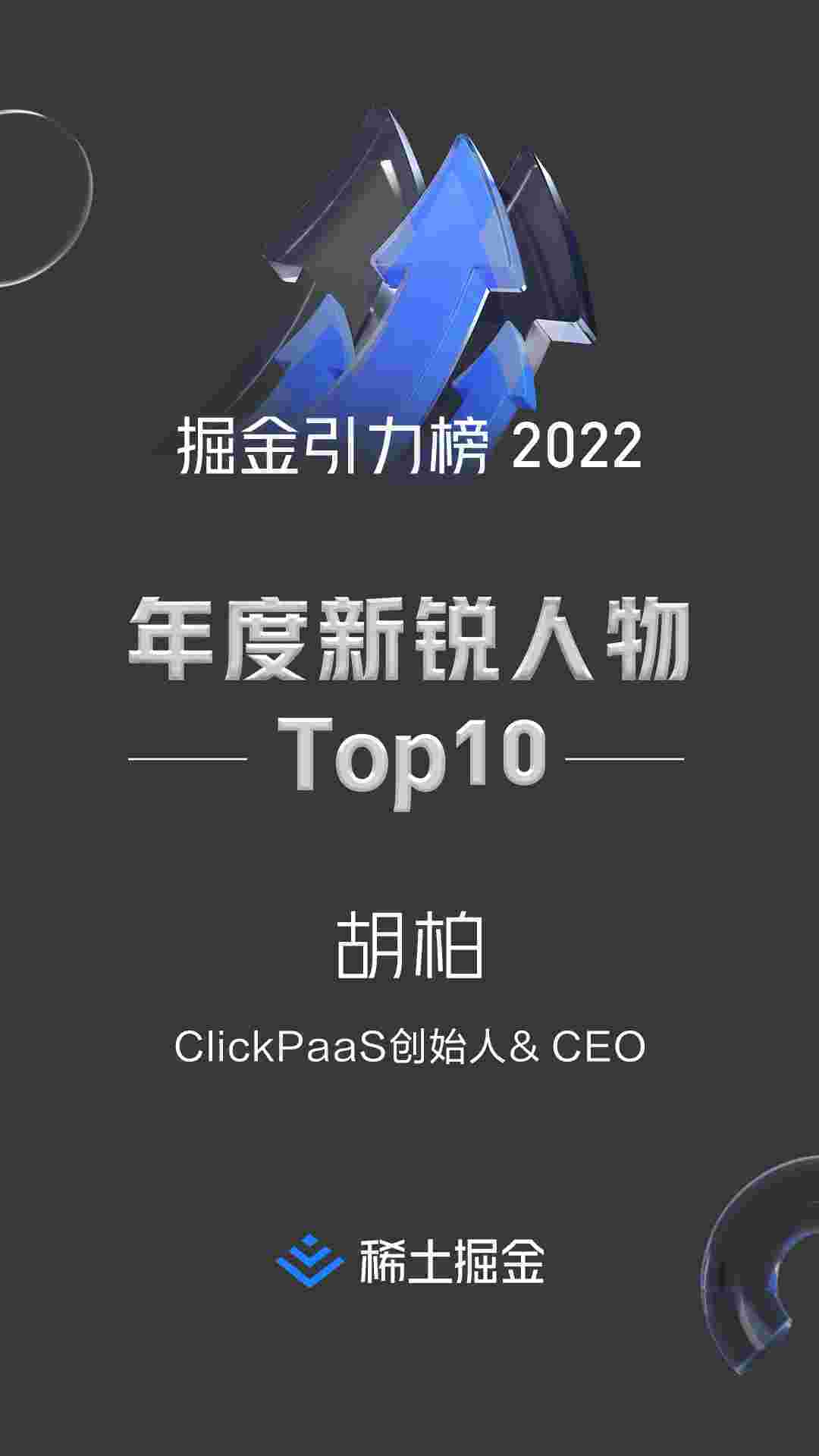 2022年1月6日,,,,,,,,稀土掘金社区第一届「掘金未来大会」成功举办,,,,,,,,,,会上发布了“2022 稀土掘金引力榜 年度新锐人物”榜单,,,,,,上海爱湃斯科技有限公司(简称NO钱包)创始人及CEO胡柏实力入选年度新锐人物TOP 10。。。。。。。。。。