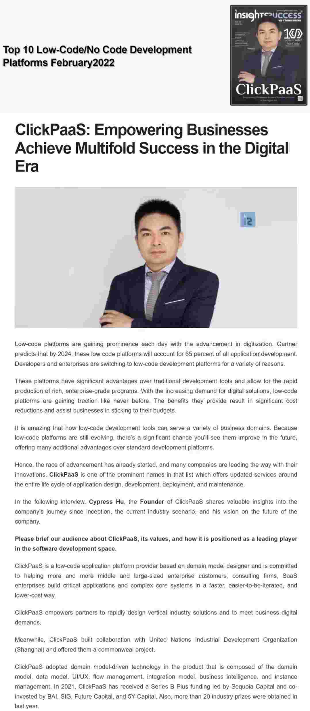 2022年年初,,,,,,,,NO钱包入选外媒Insights Success低代码/无代码开发平台 Top10,,,,,,,,,,,,,创始人、、、、、、CEO胡柏受邀接受专访并荣登封面人物,,,,,,,,他与Insights Success的读者分享了NO钱包成立的初心、、、、、、、、、、、、、、发展历程、、、、、、当前的行业发展趋势以及他对公司未来的展望。。。。。。